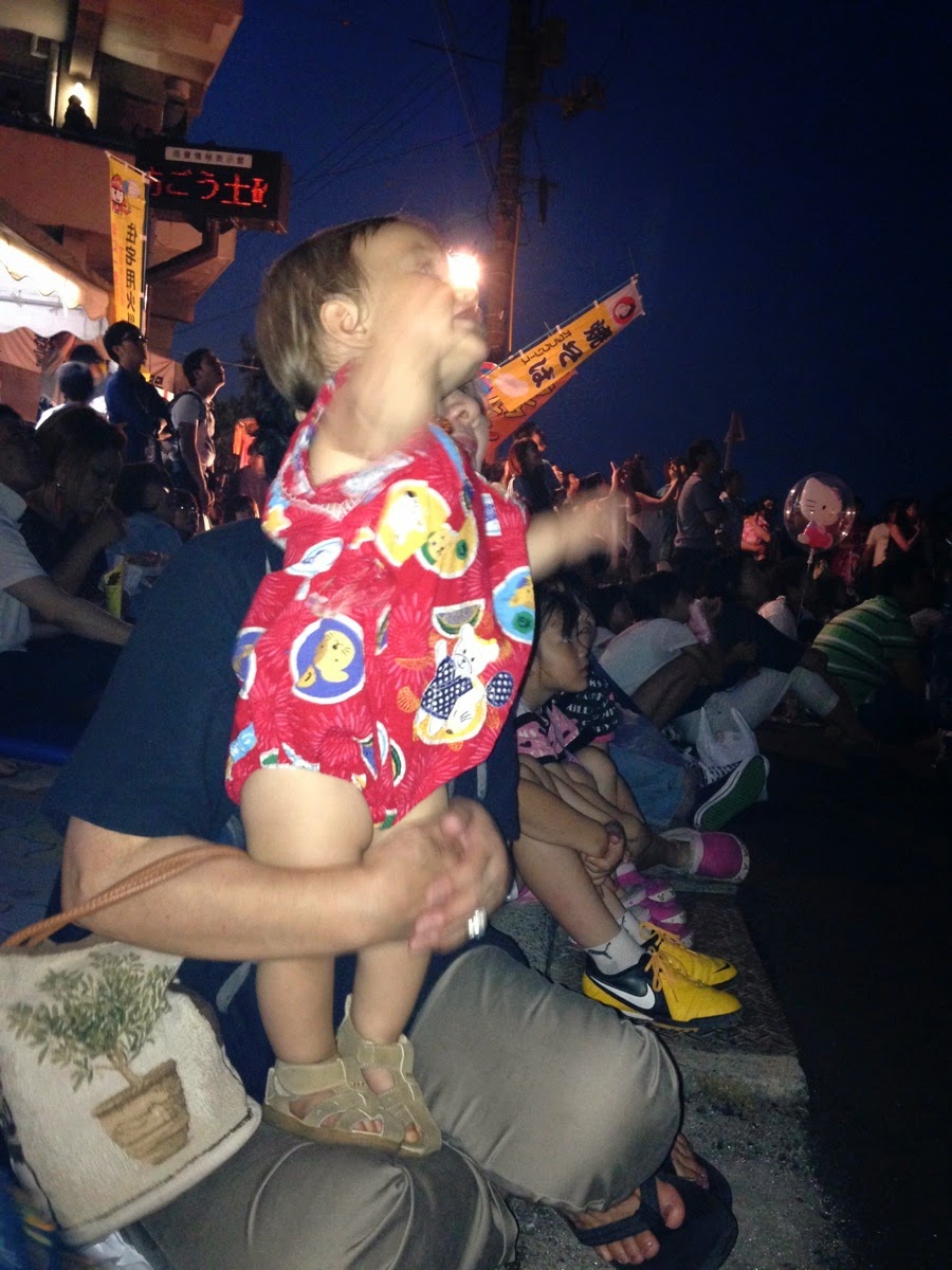 The fireworks are held each year in Tomonoura and as always, it was incredibly lively and crowded. William was exited enough to add a new word to his repertoire: hanabi, or fireworks. We arrived early enough to get a parking spot, wander around the street stalls, and find a good spot to view the fireworks.